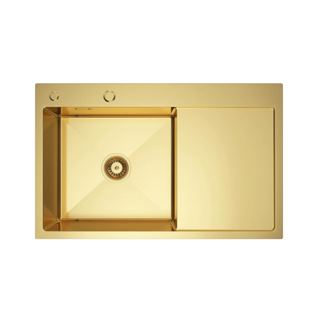 Nowoczesny, jednokomorowy zlewozmywak o wymiarach 78x49 cm wykonany ze stali nierdzewnej z elegancką powłoką PVD w kolorze złotym. Zlewozmywak posiada głęboką komorę oraz ociekacz, a jego innowacyjna powłoka PVD zapewnia odporność na korozję i zarysowania. W zestawie znajdują się wszystkie elementy niezbędne do łatwego montażu, w tym syfon odpływowy i mocowania do blatu. Idealny do nowoczesnych kuchni, łącząc estetykę z funkcjonalnością.