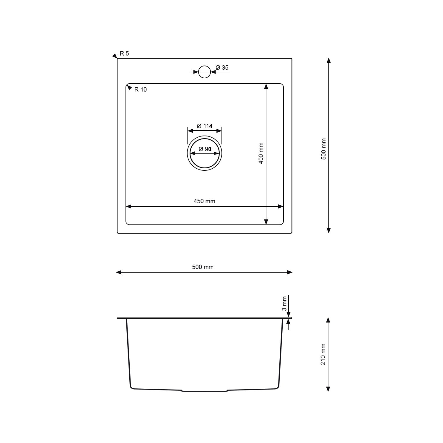 - Długość: 500 mm(dł.)x500mm(sz.)x210(gł.)