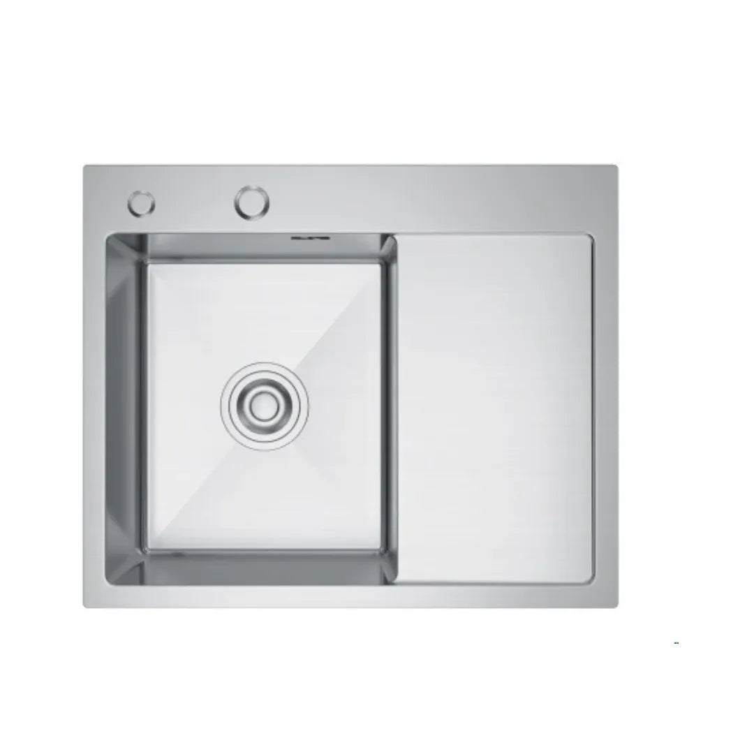 Zlewozmywak 63×50 cm ze stali nierdzewnej, jednokomorowy z ociekaczem (komora lewa) — Inox satyna, wpuszczany, głębokość 215 mm, otwory 35/28 mm, z przelewem
