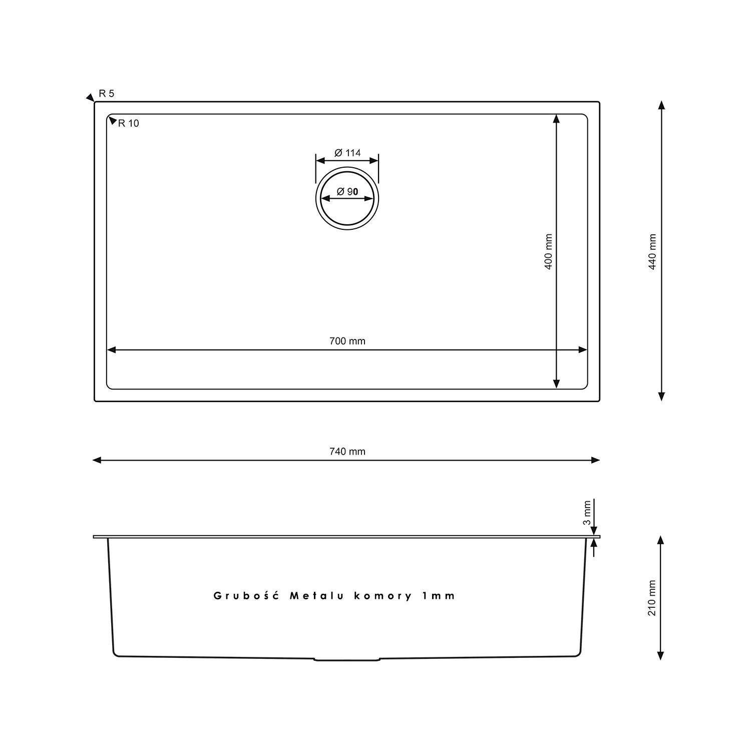 - Wymiar zlewozmywaka: 740 mm x 440 mm x 210 mm