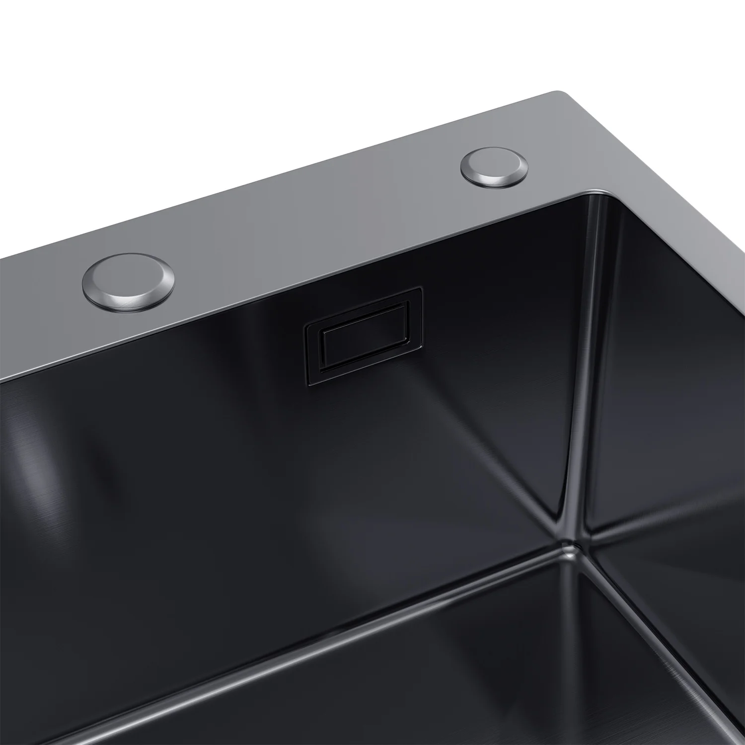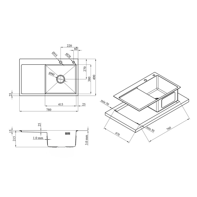 Zlewozmywak 78×49 cm ze stali nierdzewnej — jednokomorowy z ociekaczem (ociekacz lewy), PVD grafit, wpuszczany, głębokość 210 mm, otwory 35/28 mm, z przelewem