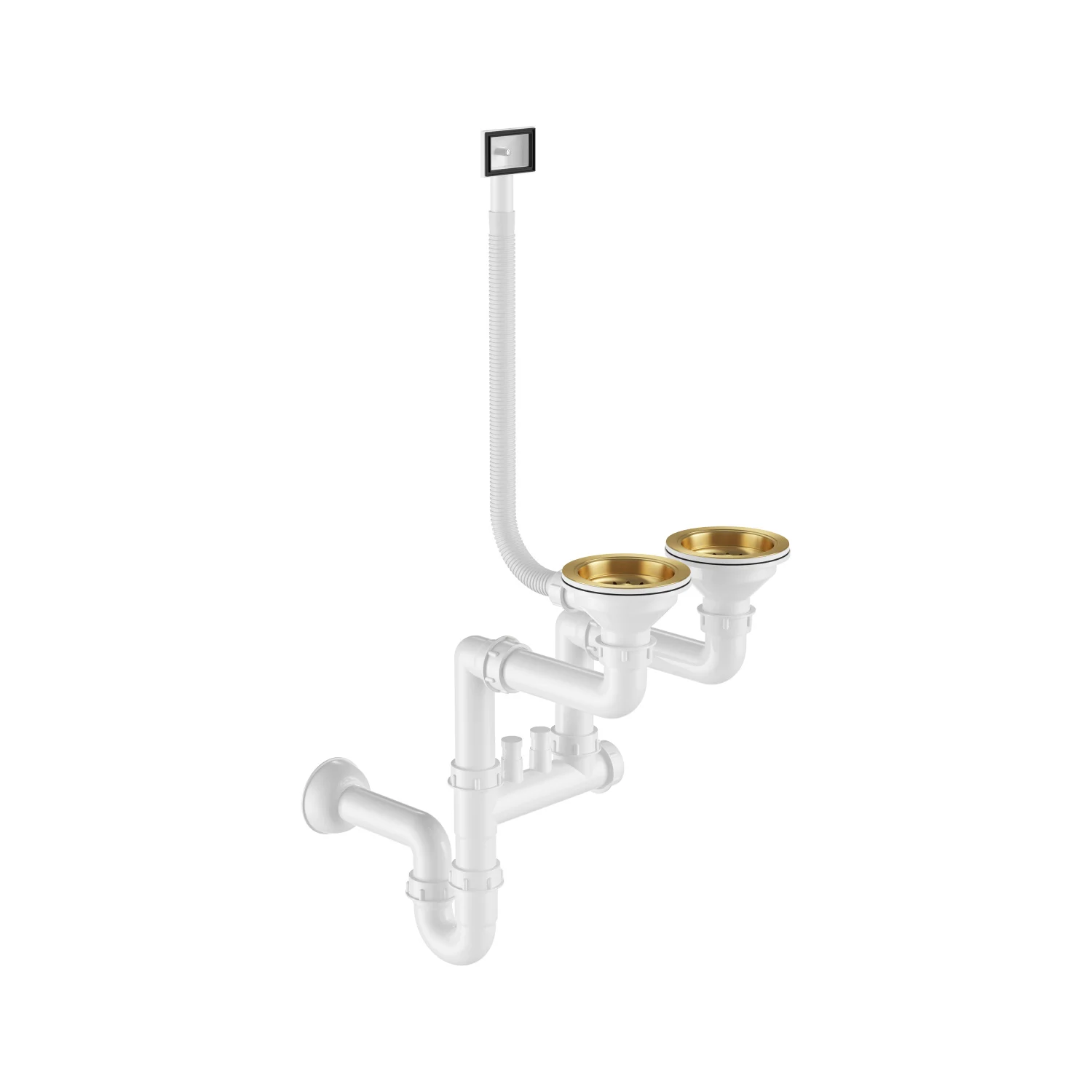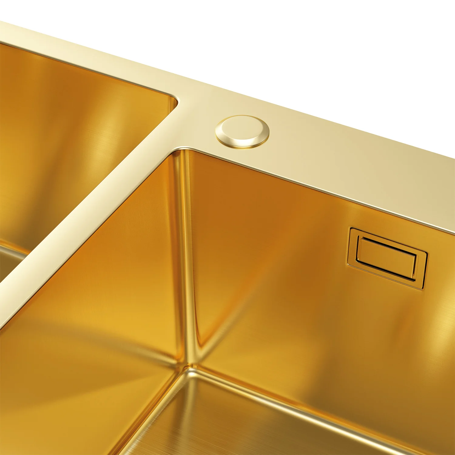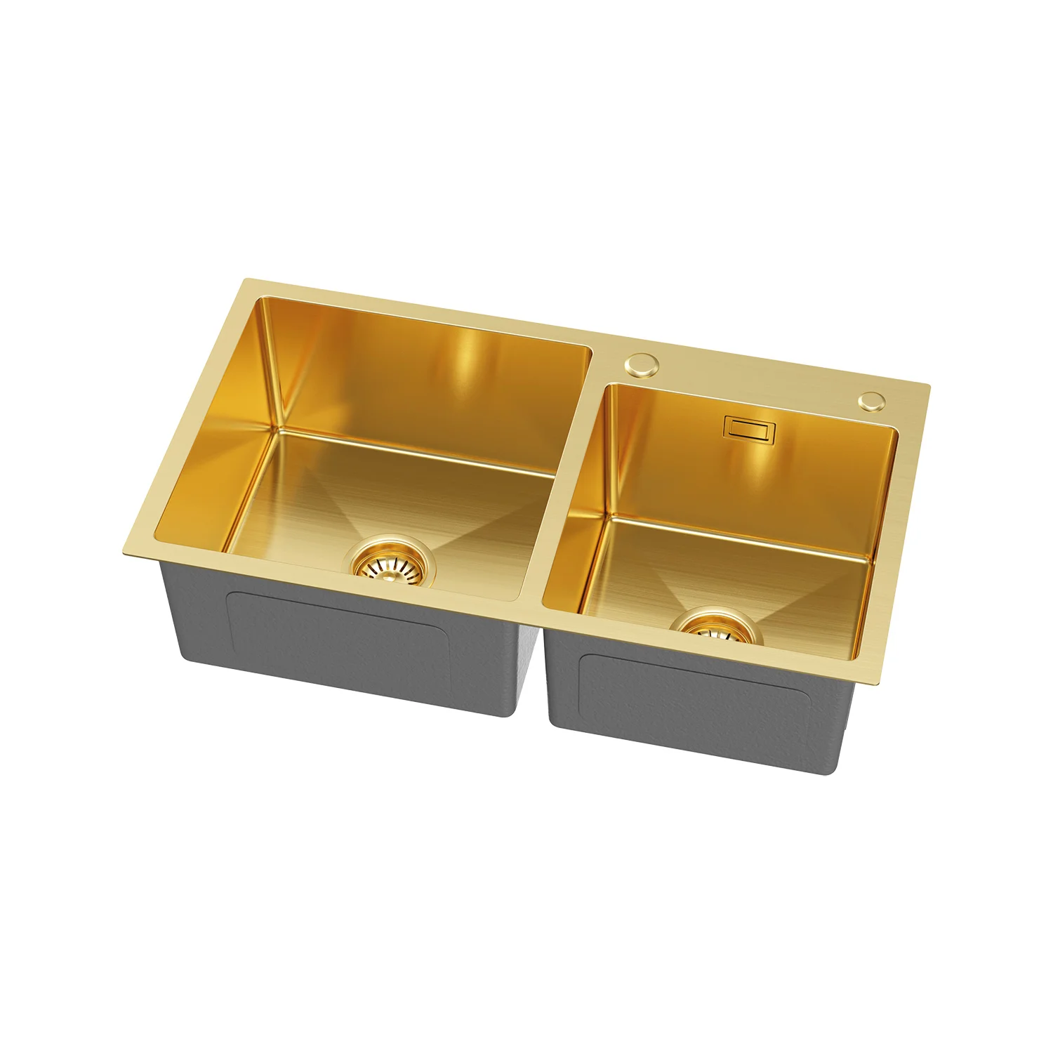 Zlewozmywak Kuchenny 78x45 cm PVD Złoty — Stal Nierdzewna, Dwukomorowy, Wpuszczany w Blat, Szczotkowana Satyna, Otwór 35 mm, Przelew, Głębokość 210 mm