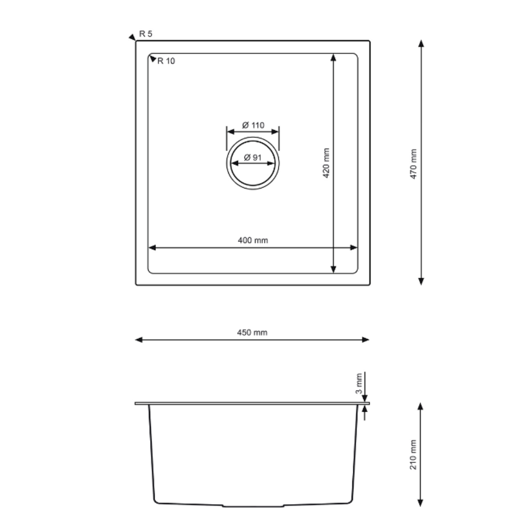 Zlewozmywak Stalowy 47x45 cm INOX (Satyna) — Jednokomorowy, Głębokość 210 mm, Przelew, Odpływ 114 mm