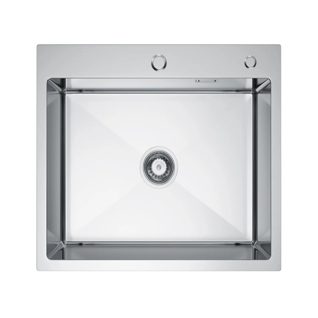 Zlewozmywak Stalowy 50x45 cm INOX (Satyna) — Jednokomorowy, głębokość 215 mm, otwór na baterię 35 mm + pod dozownik, przelew, odpływ 114 mm
