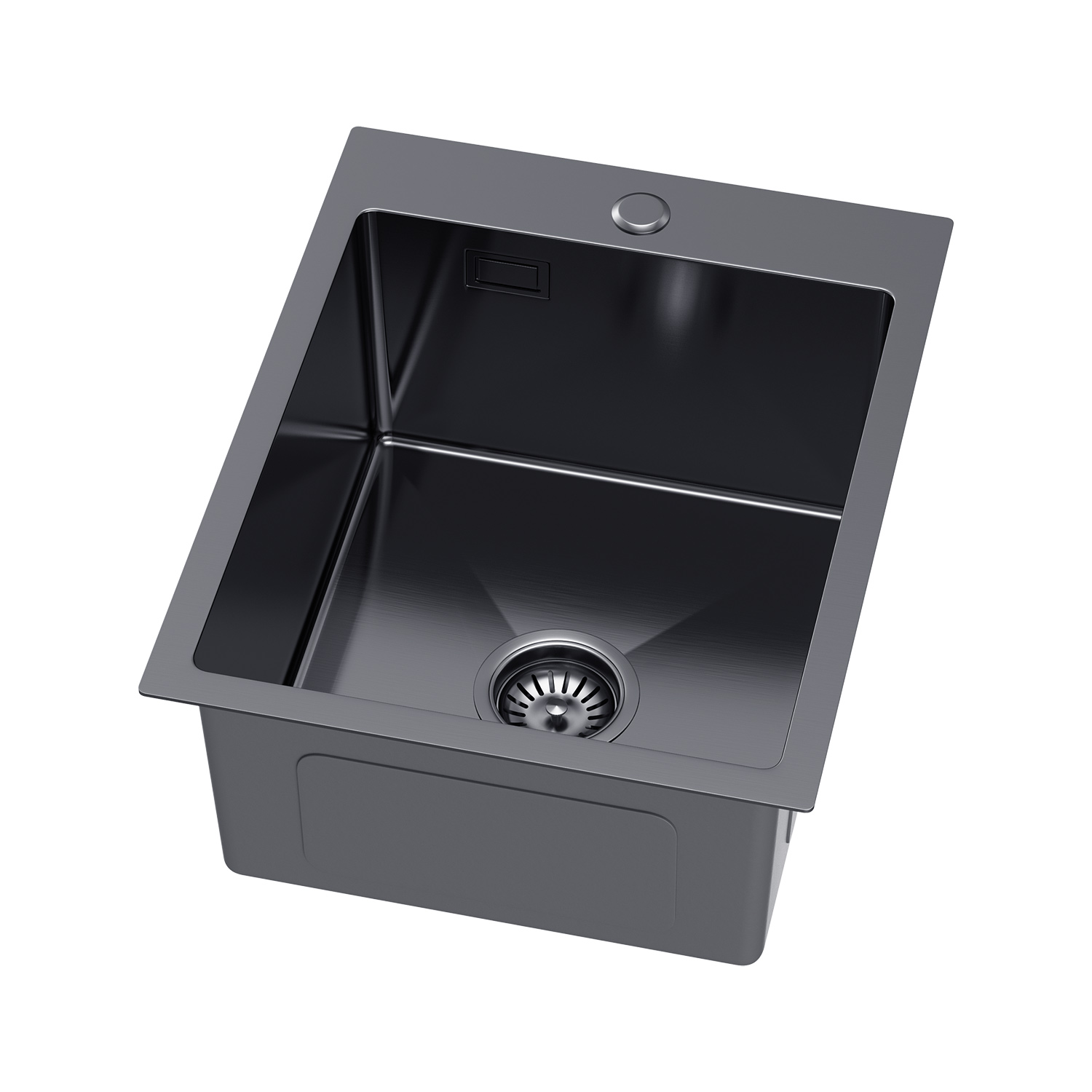 Elegancki jednokomorowy zlewozmywak w kolorze grafitowym wykonany z wysokiej jakości stali nierdzewnej z satynowym wykończeniem. Dzięki głębokiej komorze (450 mm x 350 mm), zlewozmywak oferuje wygodę przy myciu dużych naczyń. Wykończenie PVD zapewnia odporność na zarysowania, korozję i ścieranie, a dodatkowe funkcje, jak mata tłumiąca dźwięki oraz powłoka antykondensacyjna, podnoszą komfort użytkowania. Zlewozmywak można zamontować nablatowo lub podwieszany, co czyni go idealnym rozwiązaniem do każdej kuchni.