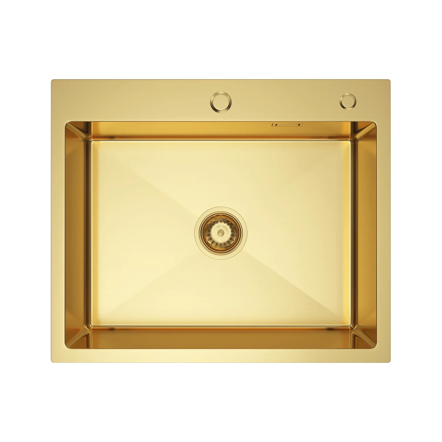 Luksusowy jednokomorowy zlewozmywak wykonany ze stali nierdzewnej z elegancką złotą powłoką PVD. Jego nowoczesny design i głęboka komora (210 mm) zapewniają wygodę podczas mycia dużych naczyń i garnków. Wykończenie PVD zapewnia odporność na zarysowania i korozję, a dzięki matom wygłuszającym oraz powłoce antykondensacyjnej, użytkowanie zlewozmywaka jest komfortowe i ciche. Możliwość montażu nablatowego, na równi z blatem lub podwieszanego, sprawia, że idealnie pasuje do każdej kuchni.