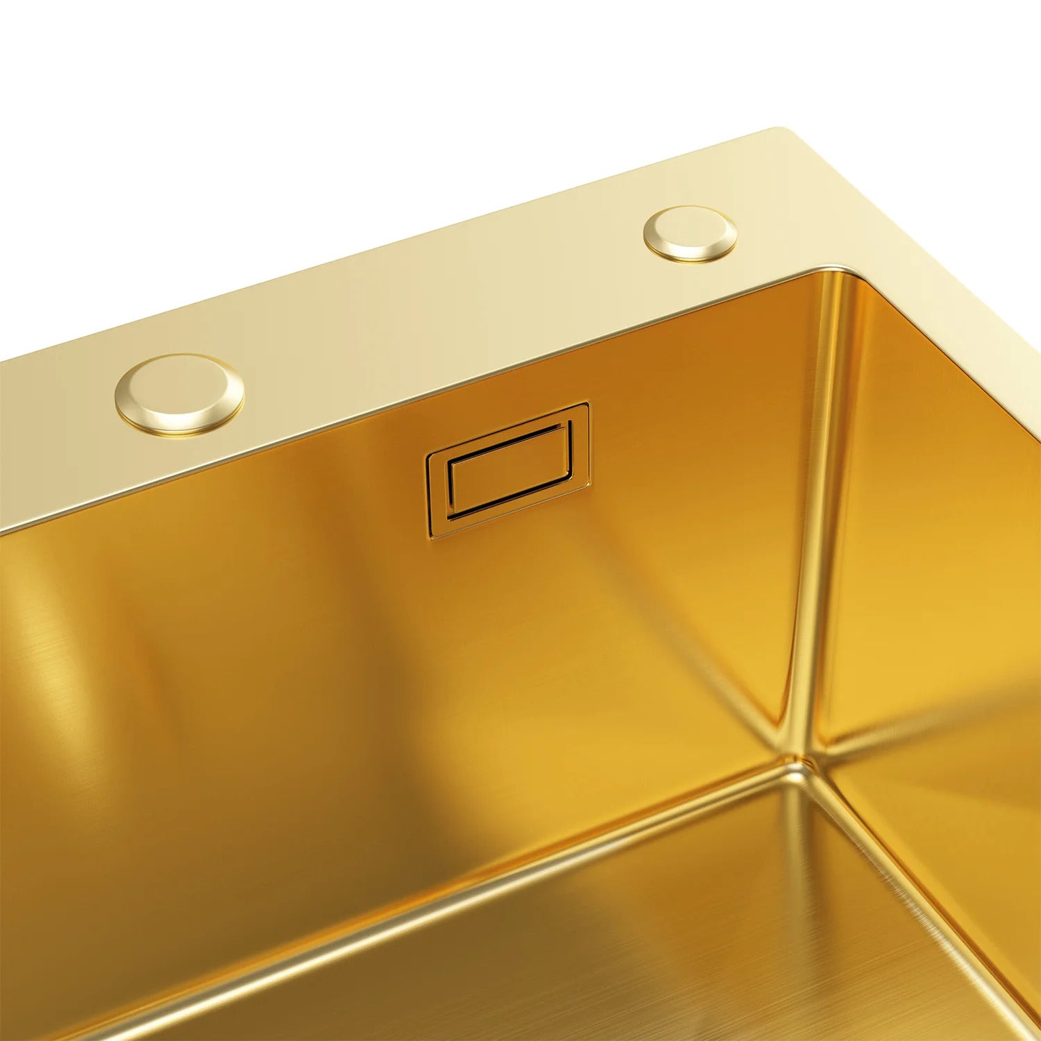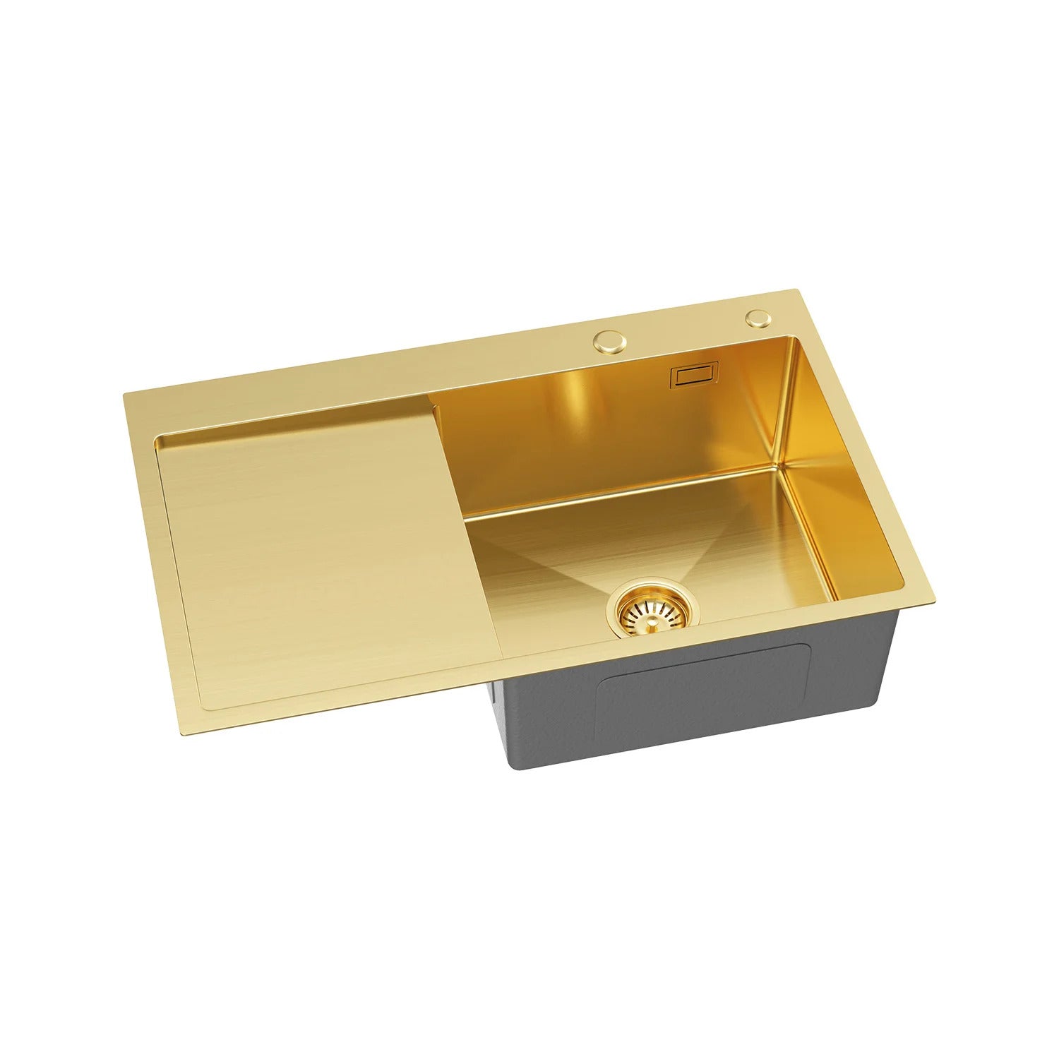 Zlewozmywak ze stali nierdzewnej 78×49 cm — jednokomorowy z ociekaczem, Złoty PVD (satyna szczotkowana), wpuszczany, głębokość 210 mm, otwory 35/28 mm, odpływ 90 mm
